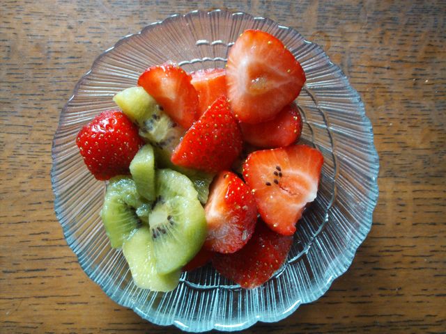 Well since then I have started adding fruit to my breakfast. If you want to do this the healthy way you need to be ready to do just a little bit of work (it’s OK it’s not much work and its easy – I’ll tell you how). You see, those pre-packed fruit salads often come with syrup and that stuff is not healthy so you need to make your own. This morning I made a strawberry and kiwi fruit salad for Chris and myself, it took me all of two minutes.