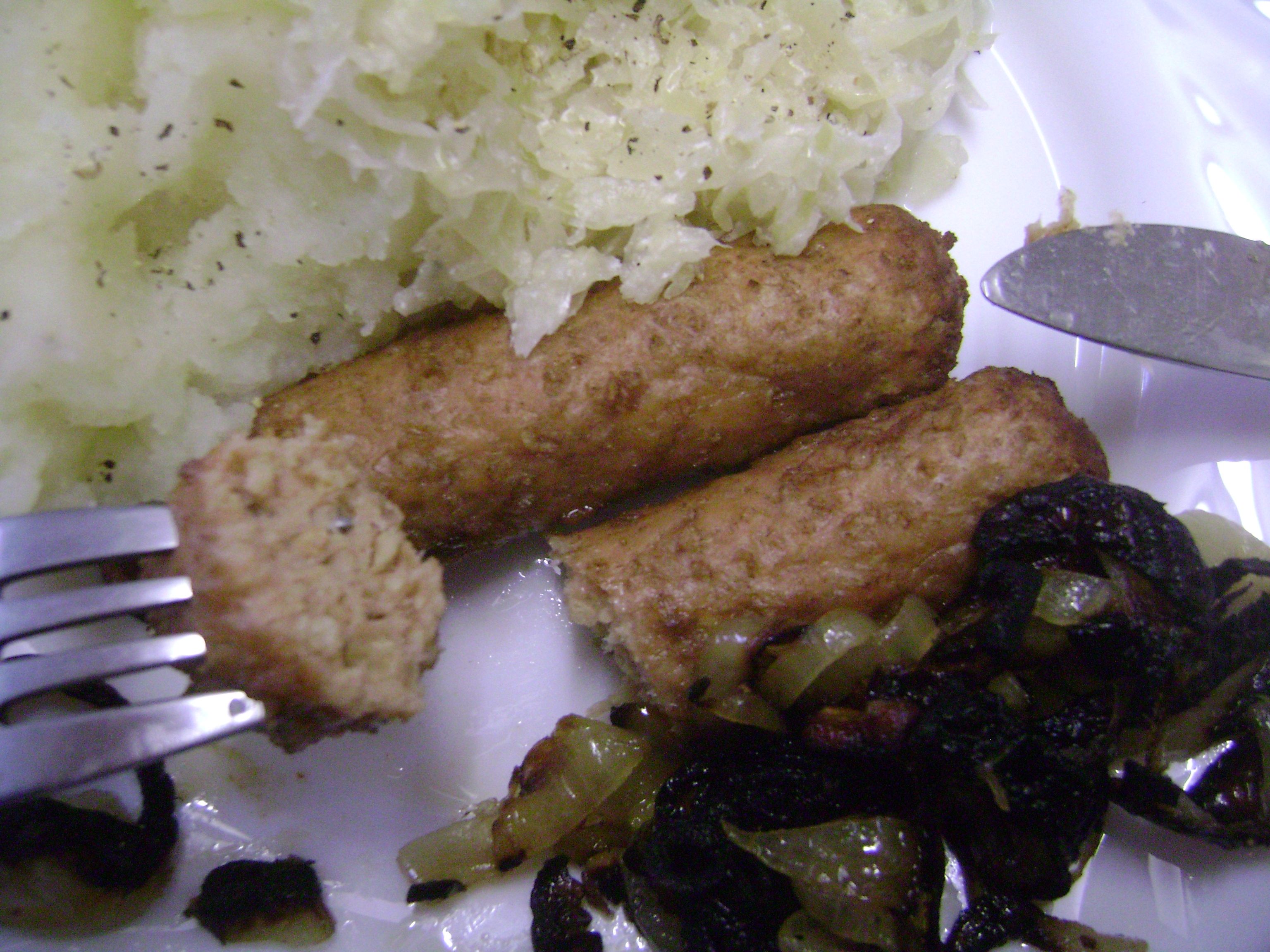 Ready to eat! veggie sausages, mashed tatties, sauerekraut & fried onions with garlic